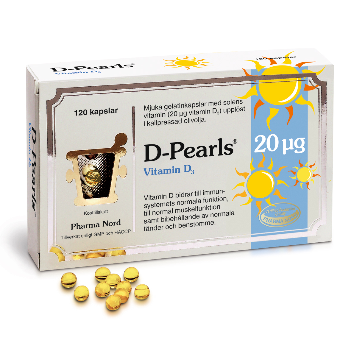 D-Pearls är små, mjuka gelatinkapslar med 20 mikrogram (800 IE) vitamin D3 i varje kapsel. Eftersom vitamin D är en fettlöslig vitamin är den löst i kallpressad olivolja för optimalt upptag i matsmältningssystemet. D-Pearls är små och därför lätta att svälja, men de kan även tuggas om så önskas. D-Pearls har testats av forskare vid universitetet i Oslo som gav idrottare olika doser av vitamin D från D-Pearls medan en grupp fick inaktiva placebokapslar. Studien visade att de olika doserna av D-Pearls absorberades väl av deltagarna medan de idrottare som fick placebo hade oförändrad koncentration av vitamin D i blodet.